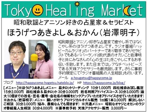 来たるゴールデンウィーク最終日である5/6(日)に 東京の水道橋にて開催される ヒーリングマーケット東京 にて私ほうげつあきよしと「ハッピーカムラジオ」 にてコンビを組んでいるおかんこと岩澤明子さん のコンビにて出展いたします。 内容は以下の通り^^…