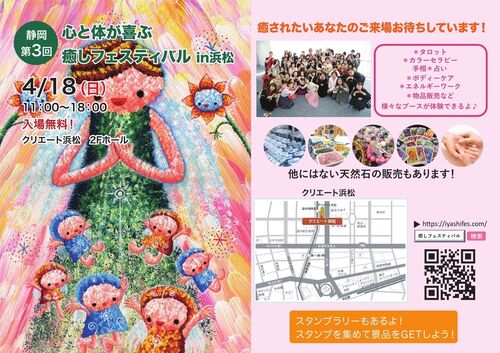【静岡第3回心と体が喜ぶ癒しフェスティバル】 開催日時:2021/4/18(日) 11:00~18:00会場 :クリエート浜松 2Fホール ヒーリング、占い、ボディケア、癒しアイテムの物販等様々な出展者がお待ちしております^^ ・出展者一覧はこちら iyashifes.com ・過去…
