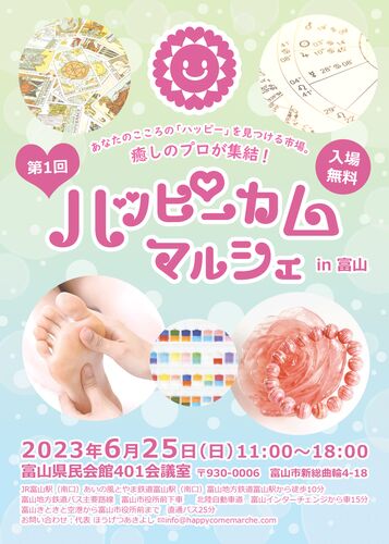 昨年6月と11月に開催した「富山心と体が喜ぶ癒しフェスティバル」が装いを新たに今年6月、タイトルを変えて開催いたします。 「第1回ハッピーカムマルシェin富山」 開催日:2023年6月25日(日)開催時間:11:00 〜 18:00開催場所:富山県民会館401会議室〒…